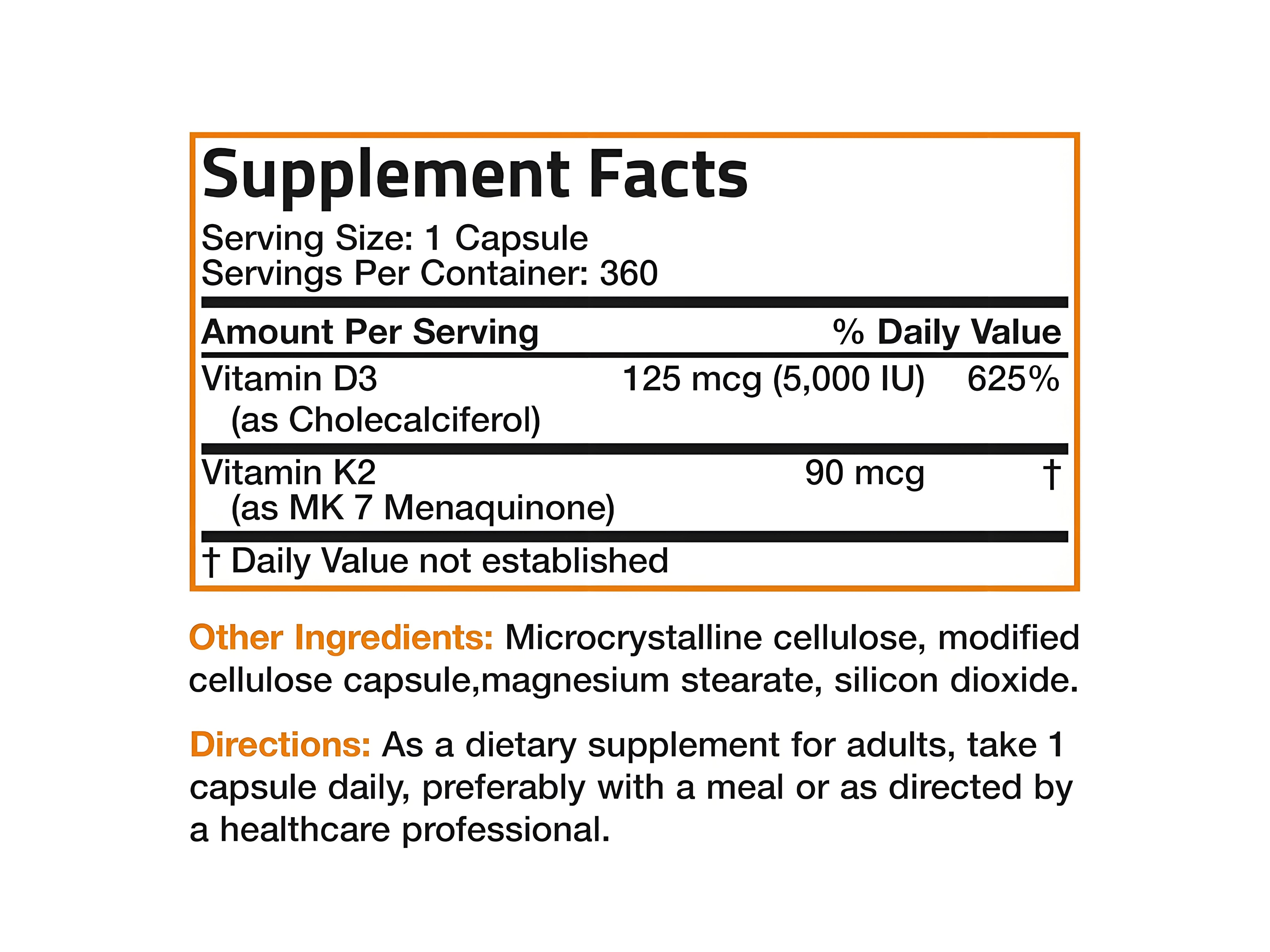 Natural sources for D3 and K2 are challenging to incorporate into a routine diet. D3 is predominantly synthesized in the body through sunlight exposure, while K2 is found in fermented foods like natto, a rarity in many diets. The **Vitamin K2 + D3 – 2-in-1 Support** offers a simplified approach, delivering pure, high-quality forms of these nutrients. This product stands apart with its clean label guarantee—it's non-GMO, gluten-free, soy-free, and free from unnecessary fillers. With 360 capsules in a modern, minimalist design, it's a nearly year-long, effortless solution for those who prioritize health and convenience.